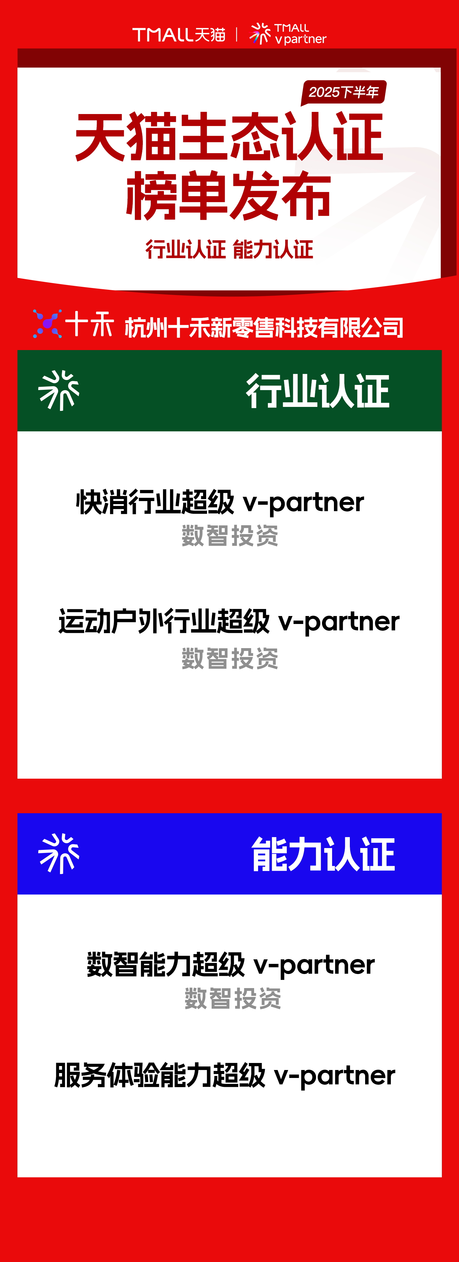 12月26日,天猫生态中心公布了2025年上半年生态认证名单,代表着天猫与服务商携手助力品牌生态经营认证体系---Tmall v-partner 首次正式亮相,此次天猫生态认证是天猫生态业务近年来最全面、最深度的一次认证。杭州十禾荣获多个认证荣誉。